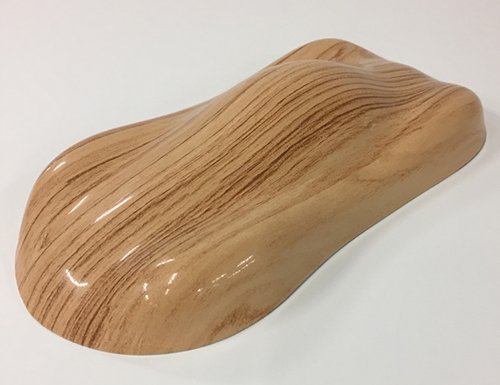 HK工法で印刷した「カーシェイプ大理石調と木目調」のテストピースには、金属製(アルミニウム)の凹凸がある車の形をした印刷が困難なものを選び、高さ40㎜の高低差がある両側の側面に至るまで「特殊ブランケット」を用いることで1パスで全面高速印刷が可能です。