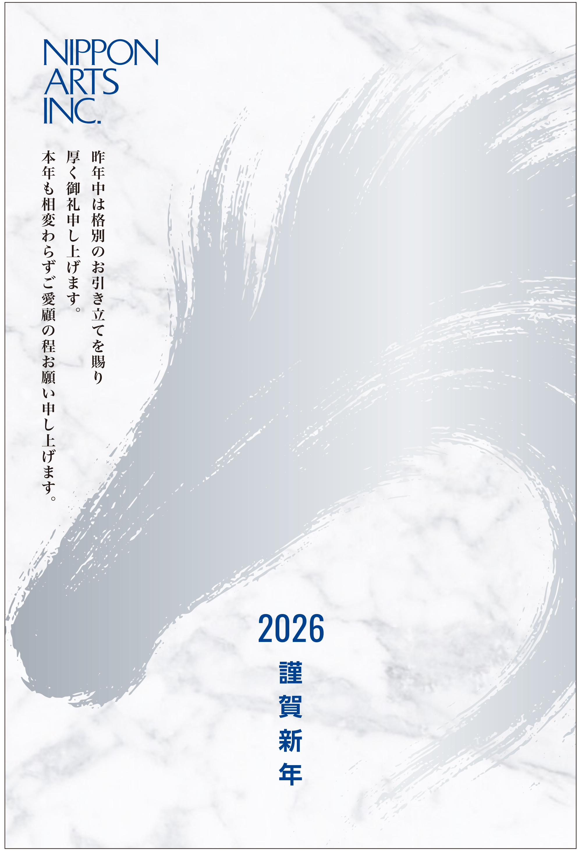 駆け抜ける馬の立て髪が風を切る瞬間を「前進の象徴」として、輝くシルバーで表現。勢いとしなやかさを併せ持つ筆の筆致に、当社の成長と挑戦の思いを込めています。